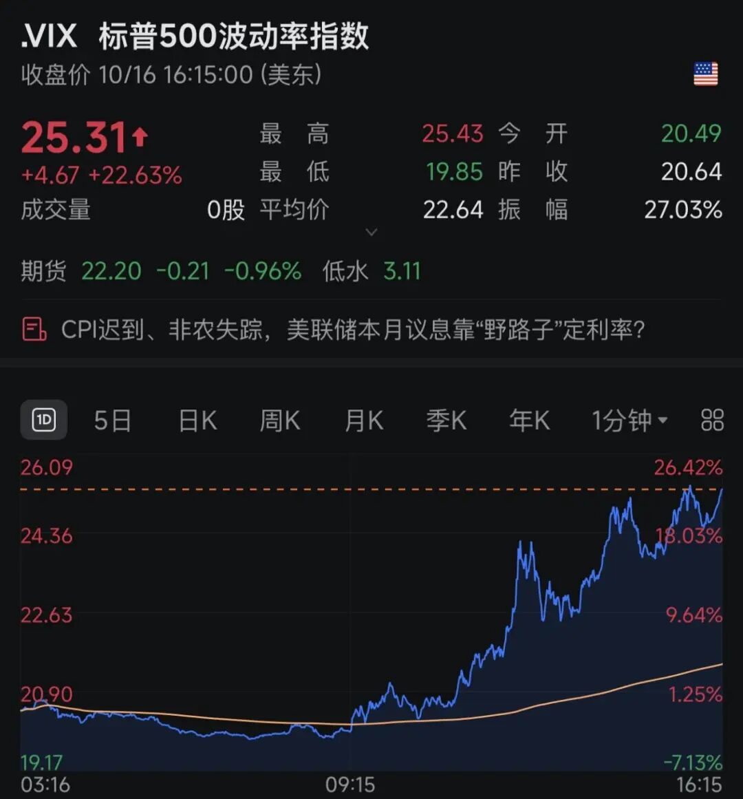 美东时间10月16日(周四),美国三大股指全线收跌,美国政府停摆进入第三周,美国国会参议院第十次否决临时拨款法案;市场对银行业坏账的担忧情绪加剧,银行股普跌;恐慌指数VIX飙升至五月以来最高水平;原油跌至五个月新低,金价再创纪录。