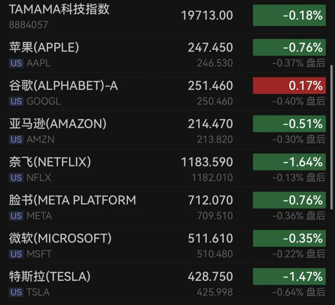 大型科技股多数下跌,特斯拉跌超1%,脸书跌0.76%,苹果跌0.76%,亚马逊跌0.51%,微软跌0.35%,英伟达涨超1%,谷歌涨0.17%。