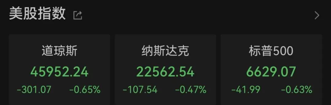 截至收盘,道指跌0.65%,报45952.24点;标普500指数跌0.63%,报6629.07点;纳指跌0.47%,报22562.54点。