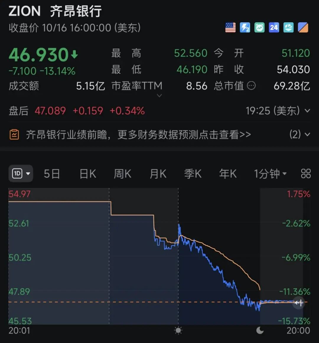 ZION银行由于对几家借款方的坏账计提了大额拨备,股价暴跌13.1%。美国西部联盟银行(Western Alliance Bancorporation,WAL)在指控某借款方存在欺诈行为后,收盘时股价下跌10.8%。