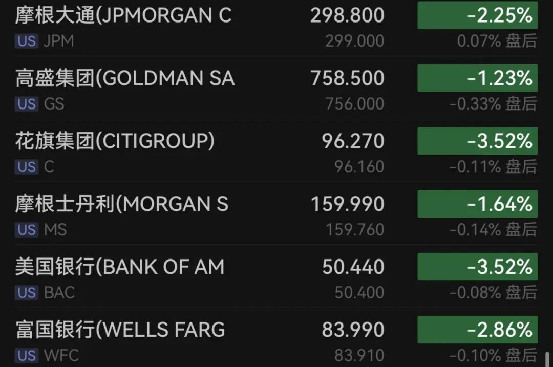 银行股全线走低,摩根大通跌超2%,高盛跌逾1%,花旗跌超3%,摩根士丹利跌逾1%,美国银行跌超3%,富国银行跌近3%。